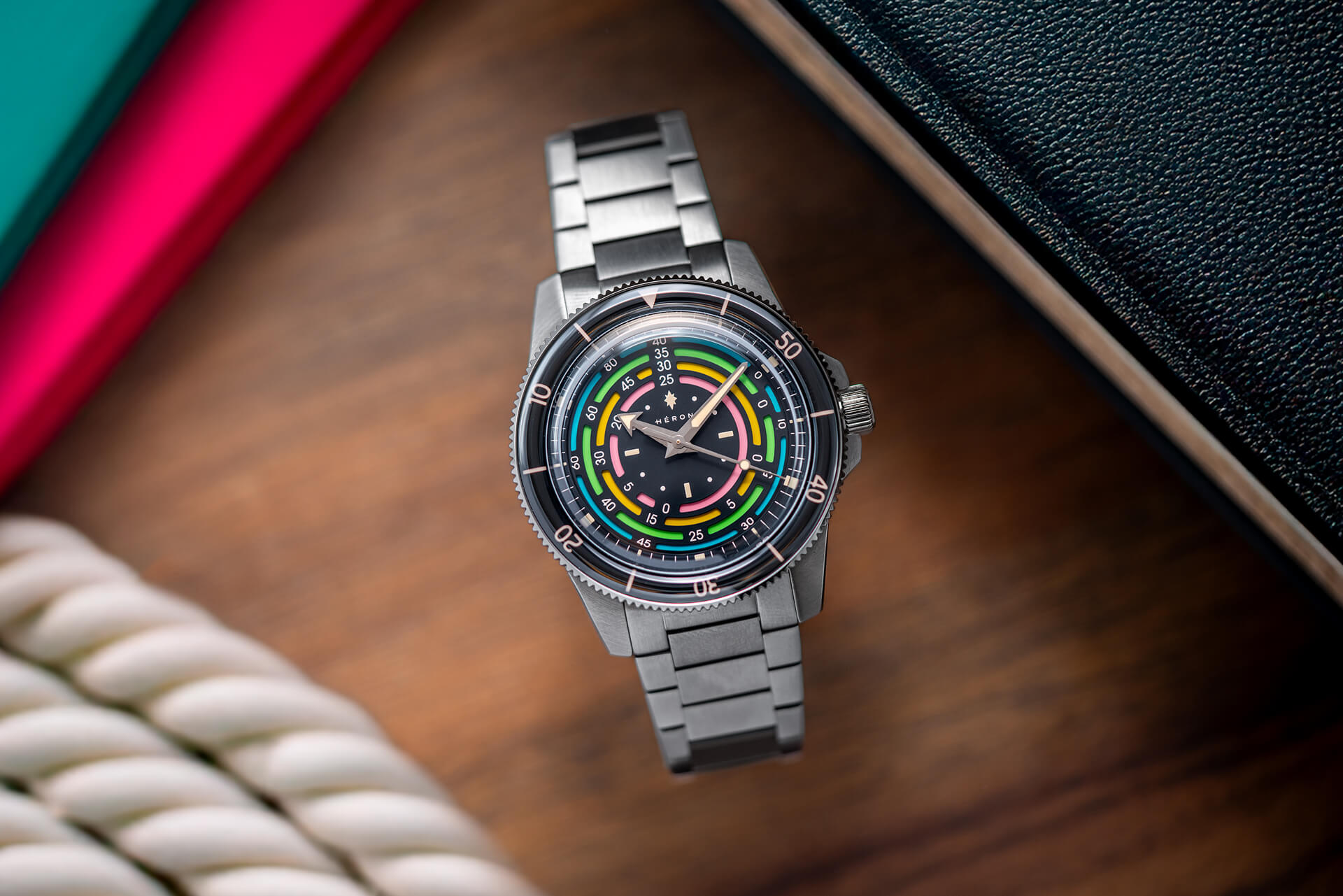 Like the original Marinor, the watch has the Héron staple of a wonderfully sculpted and appropriate caseback, a 1200HV hardened 316L stainless steel case and bracelet, and an extension clasp on the said bracelet. The Rainbow edition can also be optioned with a stunning tropical strap, making this watch look period-correct. We recommend buying the bracelet and a couple of the tropical straps.