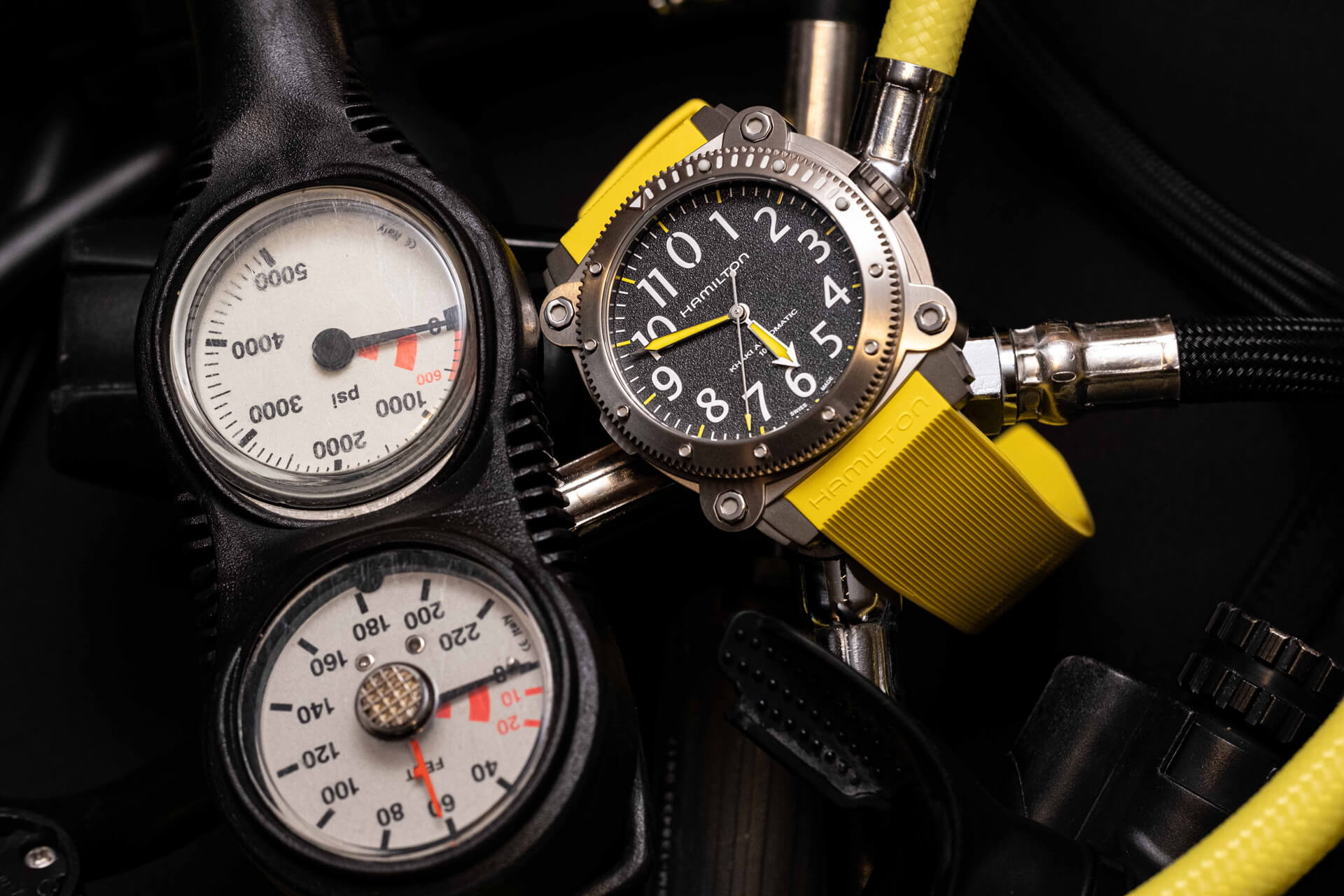 On the other hand, the new yellow model makes its presence known every occasion and has to be the most wonderful interpretation of the Below Zero. First, the textured dial calls to mind wet concrete, contrasting the perfectly stripped brushing on the hands. I never thought I would say these words, but the Below Zero in this iteration is marvelously jewel-like. Hamilton’s designers elaborated on this by splitting the zero at twelve vertically. I’ve never seen this typeface treatment before, and in this execution, it adds a level of acute forcefulness that plays well into its more extroverted character.