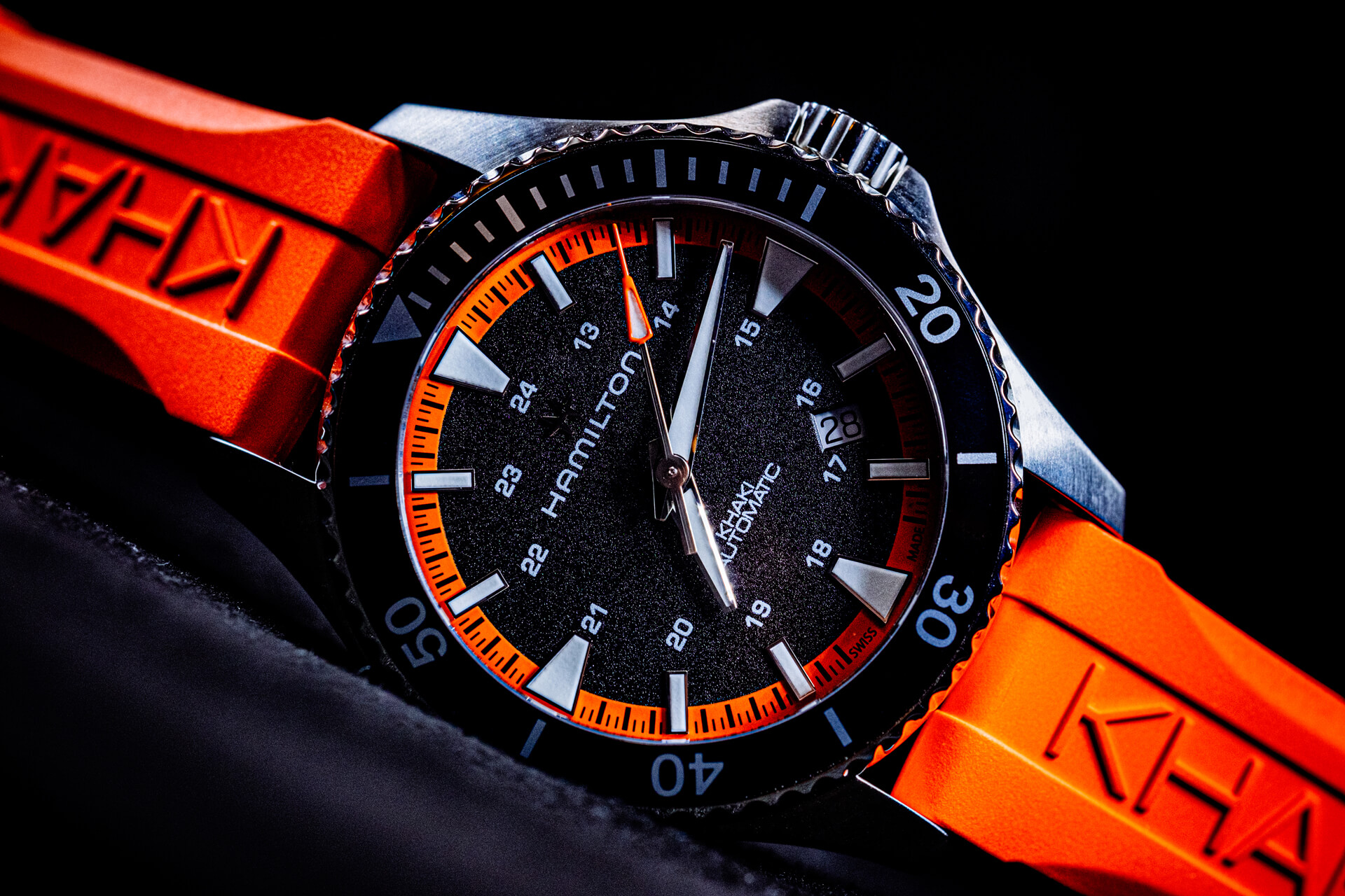 Hamilton decided to release this timepiece in three colors – the orange you see here, a hot yellow, and an even hotter pink. Colorful dive watches are nothing new to the marketplace, but the implementation here is what counts. Released just in time for the summer, such colorful dive watches are deemed acceptable with most of one’s wardrobe save for the most formal. For regions with four definable seasons, summer represents adventure, leisure, and joy. Levity and a true sense of exuberance are what Hamilton brings to the table, and he goes to great lengths to pull this off.
